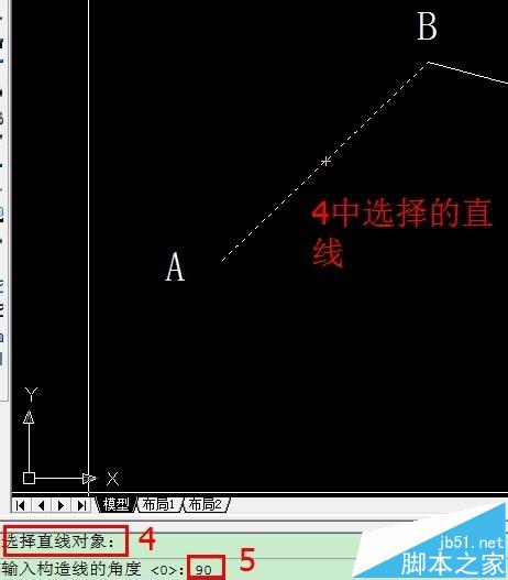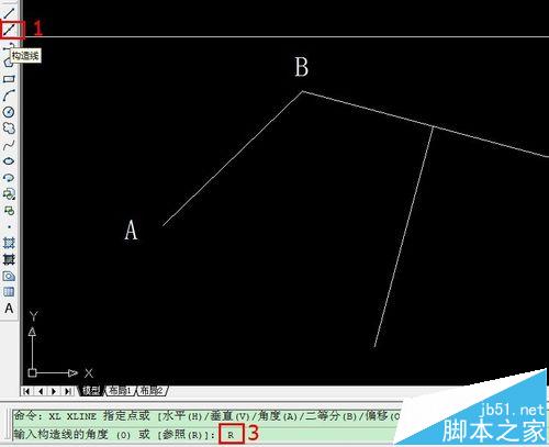 1、輸入XL或者點擊“構造線”命令,按照提示依次選擇角度A,參照R,選擇直線,角度90度。如下圖標識的步驟