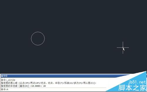 輸入C,回車,調(diào)用畫圓的命令,在圖中單擊確定圓的圓心,輸入20,回車,畫一個(gè)半徑20的圓,如下圖所示。