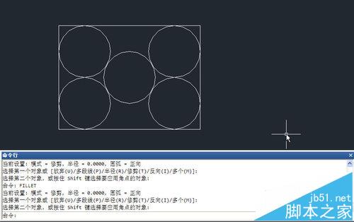 6、輸入F命令,回車,如果命令行提示的默認(rèn)圓角半徑不為0,輸入R回車,輸入0,回車,然后單擊相鄰的兩條切線,將他們連接起來(lái),回車,重復(fù)執(zhí)行圓角命令,將四條直線都連接到一起,如下圖所示。