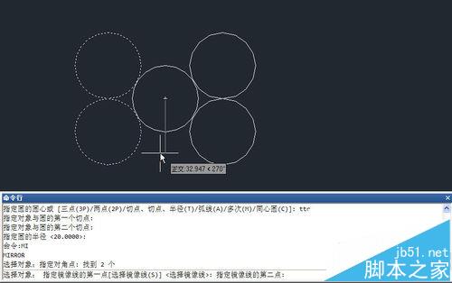 4、輸入MI,回車,執(zhí)行鏡像命令,框選豎向排列的兩個(gè)圓,回車,捕捉中間圓的圓心,保證正交打開(kāi)的狀態(tài)下,向下拖動(dòng)光標(biāo),鏡像生成右側(cè)的兩個(gè)圓,如下圖所示。