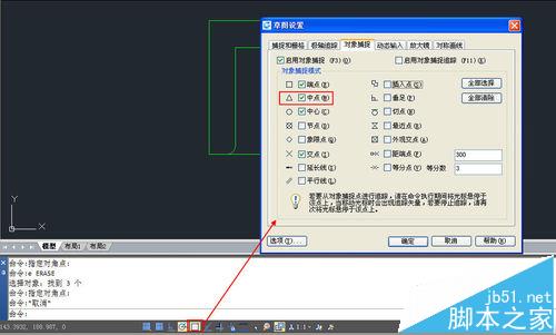 2、綠色是現有圖形,我們要畫一個圓,圓心對齊橫豎兩條直線的中點,也就是說要取頂部直線中點的X坐標,取側面直線中點的Y坐標,Z軸可以忽略。在底部狀態欄右鍵單擊對象捕捉按鈕,確認中點捕捉選項已經被打開,如下圖所示。