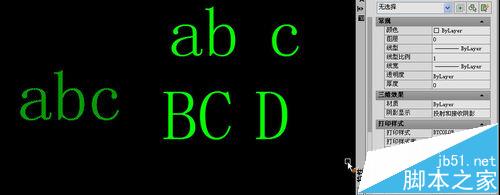 這種方法的好處是可以一次性處理多個(gè)文字對(duì)象,只需將這些文字都選中后,輸入X,回車,將這些文字炸開成單行文字。單行文字每個(gè)字符不能有獨(dú)立的特性,就不會(huì)存在上述問題了,但多行文字的每一行都會(huì)變成一個(gè)單行文字對(duì)象,單獨(dú)設(shè)置過特性的文字也會(huì)被分解成獨(dú)立的對(duì)象。例如上面的樣例被分解后就會(huì)變?yōu)樗膫€(gè)單行文字,如下圖所示。