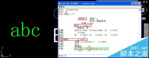 3、可以肯定的是,出現(xiàn)這種問題的應(yīng)該是多行文字。如果是單行文字匹配時(shí)出了問題,那就需要從源對(duì)象上找問題了,你可以選中源對(duì)象查看。我們可以看到這個(gè)文字的文字樣式是test,顏色是BYLAYER,字高是2.5。但顯然文字中不是每個(gè)字母都使用了這些設(shè)置,有的改了顏色、有的改了字高,有的改了字體。當(dāng)然這張例圖中,因?yàn)橥粋€(gè)文字中采用了多種設(shè)置,我們一眼就能看出來這些字母的設(shè)置被改了,如果所有字體都采用了相同的顏色、字體、字高,我們就看不出來文字的這些特性被修改過了。