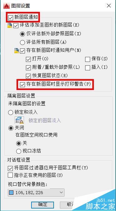 3、在彈出的“圖層設置”對話框中,取消選中“存在新圖層時顯示打印警告”。或者直接取消選中“新圖層通知”。這樣可以一勞永逸的解決“協調新圖層”問題。