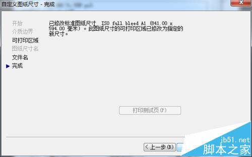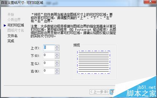 3、單擊【修改標準圖紙尺寸(可打印區域)】。在【修改標準圖紙尺寸】組合框中選擇需要修改的圖紙】,打開【自定義圖紙尺寸-可打印區域】對話框。調整【上】【下】【左】【右】為【0】,單擊下一步