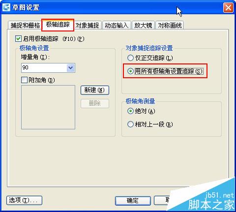 1、在“極軸追蹤”選項卡中主要設置對象追蹤的形式。
