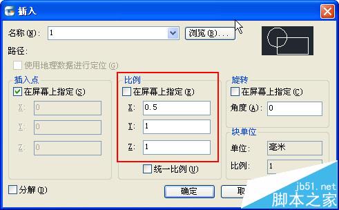 2、插入剛創建的圖塊,并在插入對話框中設置各軸向比例,如下圖所示。如果創建這個圖塊只是為了不等比縮放圖形,創建完圖塊后,可以直接在特性面板(CTRL+1)中修改圖塊各軸向的比例。