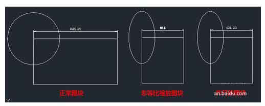 1、各向比例不相等的圖塊是無法用參照編輯(REFEDIT)命令編輯的,在以前很多人遇到圖塊雙擊不能編輯的問題都是這個原因。高版本CAD的塊編輯(BEDIT)編輯的是塊定義,雙擊非等比縮放圖塊可以進行編輯。對圖塊進行不等比縮放,不僅會帶來圖形外觀的變化,一些圖形數據也會發生變化,例如炸開這樣的圖塊,圓會變成橢圓,如下圖所示。