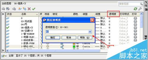 1、在CAD中打開圖層管理器對話框,可以看到有一列是透明度,單擊圖層后面的透明度值,就會彈出圖層透明度對話框,在其中可以輸入透明度的數值,如下圖所示。
