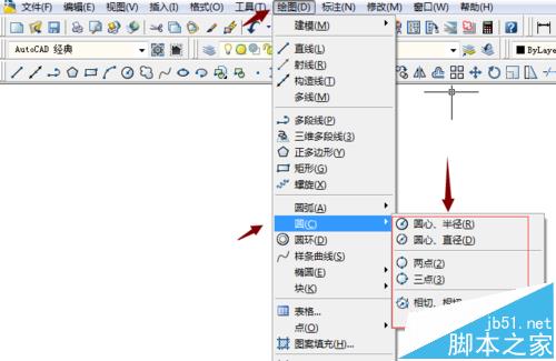 2、在CAD操作頁面的菜單欄里繪圖命令,點擊繪圖命令找到圓形命令,將鼠標放置在圓形命令上呈現了六種圓形繪制的方式。
