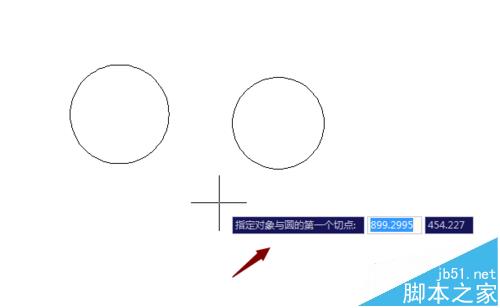 點擊三點方法,相切、相切、半徑,這也就需要在繪制之前存在相關圖形,如已經存在兩個圓形,點擊第一個與圓相切的點,然后點擊第二個圓的相切點,輸入半徑,或直接回車,即可。