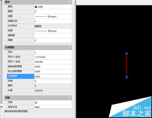 2、7選中線段,右鍵,特性,在對話框中,填入全局寬度,如我填入5000,則線段就變寬了。