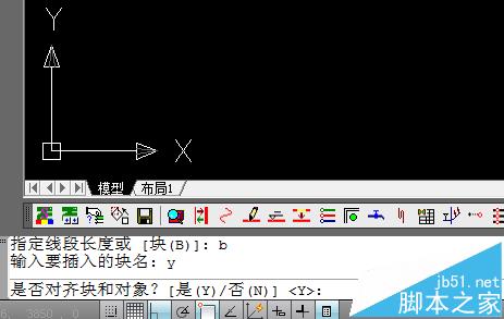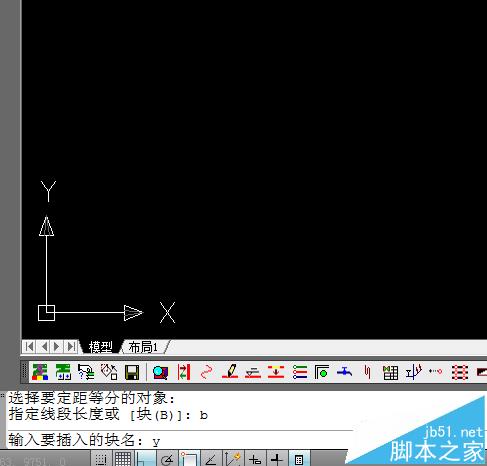 2、指定用于定距離等分的塊,先輸入“b”命令表示用塊作為等分的對象。我們這里的塊名字為“y”。