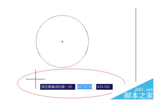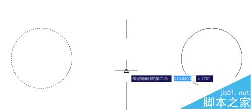 5、選中圓形即要鏡像的圖形后點擊回車鍵,彈出指定鏡像線的對話框,首先指定鏡像線的第一點,然后彈出指定鏡像線的第二點。