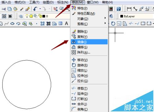 3、那我們另一種方法就是使用鏡像特征進行圖形繪制,我們在CAD菜單欄中找到修改命令,在修改命令里找到鏡像特征。