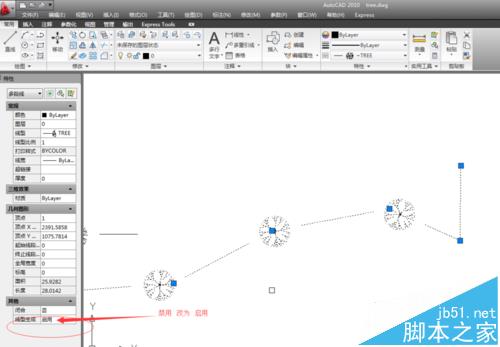 12、選好線型后,選擇多段線命令繪制線如圖。畫完后如果顯示一根線,沒有中間的tree,這里可在特性面板里改變選中線的“線型生成”,將“禁用”改為”啟用“。