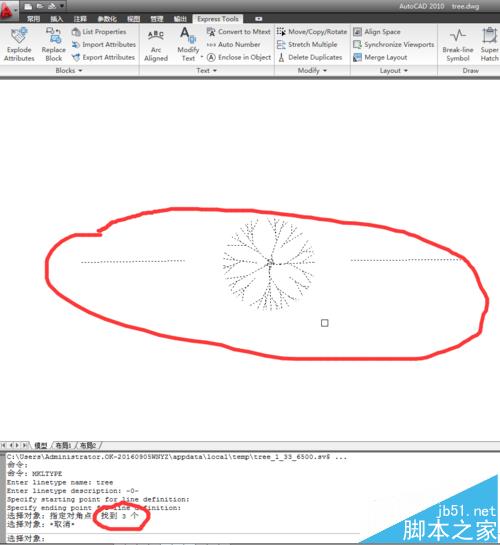 6、選擇完ending point 后,開始選擇對象,這里框選線和中間文字,命令行提示選中了三個。然后回車完成制作過程。