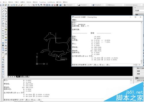 4、接下來點擊工具-查詢-面域/質(zhì)量特征。選擇我們剛剛建立的面域,確定。彈出一個類似于文本的文件。最下面是對面域的分析,其中質(zhì)點就是面域的重心。