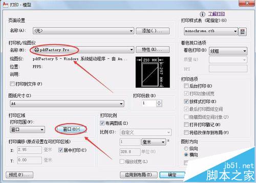 2、在打印機下拉菜單中找到PdfFactory.Pro 打印機,選擇它,打印范圍選擇窗口,點擊窗口。