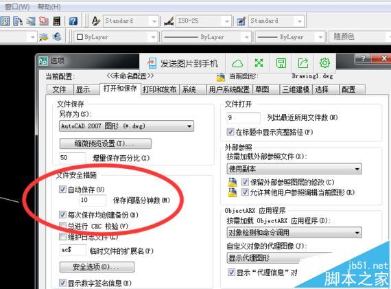 6、最后,點“選項”的的“打開和保存”,可以設置保存時間,一般的選擇10分鐘就可以了,如果比較熟練可以選擇15或者20分以上。注意要勾上創(chuàng)建備份,這樣在出現(xiàn)文件突然關(guān)閉時或者出現(xiàn)錯誤時還可以重新找回來。