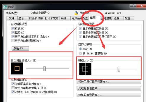 5、在“選項”彈出的對話框中點擊“草圖”,然后可以調(diào)整自動捕捉標記大小和和靶框大小。