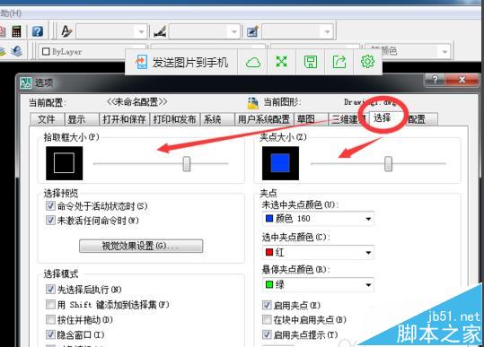 4、在“選項”彈出的對話框中點擊“選擇”,然后可以調(diào)整拾取框大小和夾點大小了。