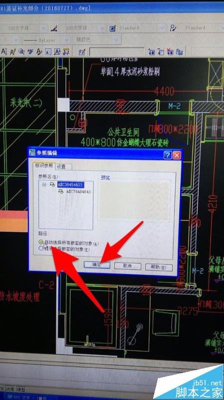3、接著點擊參照編輯——單擊要編輯的圖塊——選擇【自動選擇所有嵌套的對象】——確定,就可以使得圖塊在圖紙中原有位置進行編輯。