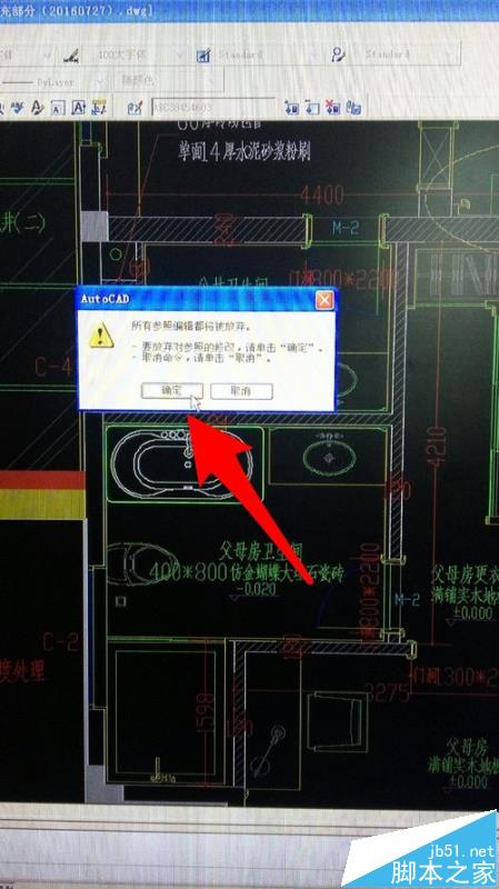 4、在對圖塊修改后,點擊如圖箭頭所示按鈕,彈出對話框,提示是否放棄對塊所做的修改,點擊【確定】,放棄之前所做的修改。