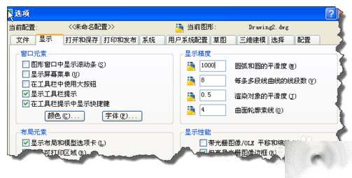 4、在“選項”窗口,顯示選項卡中,將顯示精度圓弧和圓的平滑度調(diào)整為1000。再re指令就要以解決問題。