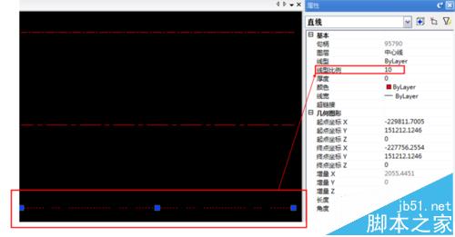 2、有時為了圖紙需求,需要隨意變動中性線的比例以達到適當的顯示效果,就可在屬性欄中隨意改動比例,如下圖所示三種比例的中心線。只需改動屬性欄中“線性比例”的數值就可達到自己想要的比例的中心線。(虛線、雙點劃線等其他線的比例和此一樣都可自由調整。)