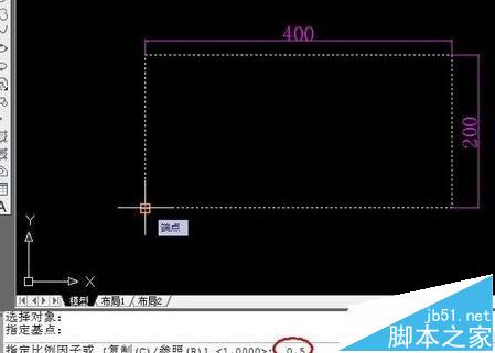 5、選擇矩形,如下圖,我選擇矩形的一個(gè)頂點(diǎn)作為基點(diǎn),我的比例因子輸入的是0.5(比例可自己感覺(jué)需要輸入)