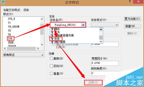 3、選擇產生問號的樣式,如在本文中,選擇 TUK ,然后修改后面的字體名 為 宋體,然后點擊 應用: