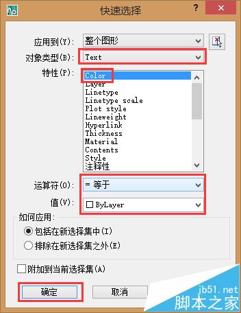 5、對象類型選擇 Text,然后顏色 選擇 ByLayer ,然后點擊 確定 (即選擇所有設置為默認顏色的文字):