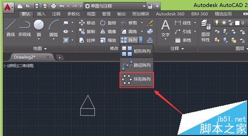 4、點擊陣列后面的三角,在下拉菜單里找到環形陣列選項,如圖所示: