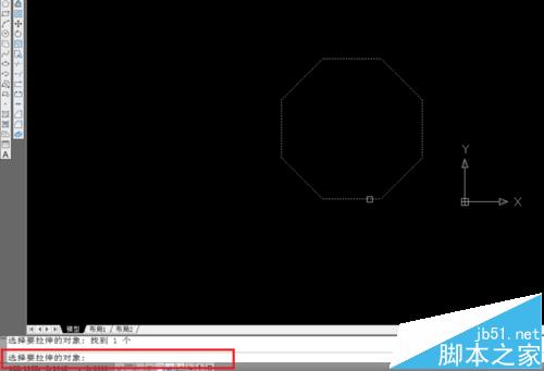 8、單擊拉伸圖標。跟著操作提示走。選擇拉伸對象-----------點擊8邊形-----------右擊確定,截圖紅框處著重看。