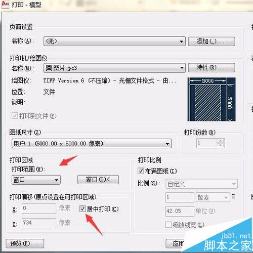 5、在“圖紙尺寸”里找到我們?cè)O(shè)置的尺寸,點(diǎn)擊“窗口”選中全圖,勾選“居中打印”。