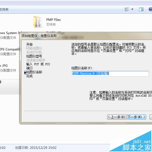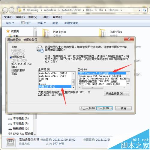 2、點(diǎn)擊后,選擇“添加繪圖儀向?qū)?/strong>”,一直點(diǎn)下一步到“繪圖儀型號(hào)”,選擇“光柵文件格式”,型號(hào)選“TIFF version6(不壓縮)”。
