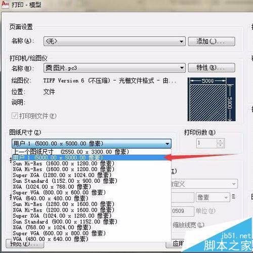 4、Ctrl+P(打印快捷鍵)打印,在“打印機(jī)/繪圖儀”里找到我們?cè)O(shè)置的打印機(jī)。點(diǎn)擊旁邊的“特性”改變尺寸。“勾選創(chuàng)建新圖紙”改為“5000X5000”像素。然后確定。(如果設(shè)置大了會(huì)卡就改為3000,一般都是在3000-6000)。