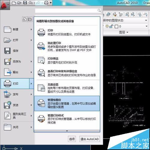 1、以CAD2010為例,打開我們要導(dǎo)出的圖,點(diǎn)擊“打印-管理繪圖儀”(因?yàn)榘姹静煌Q也有不一樣),如果是2007經(jīng)典操作界面,點(diǎn)擊“文件-繪圖儀管理器”也一樣。