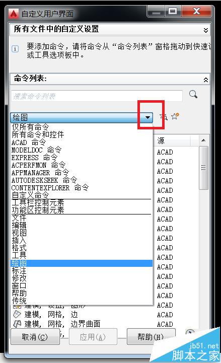 3、以添加一個繪圖工具的快捷圖標為例。點擊紅框處的下拉箭頭。