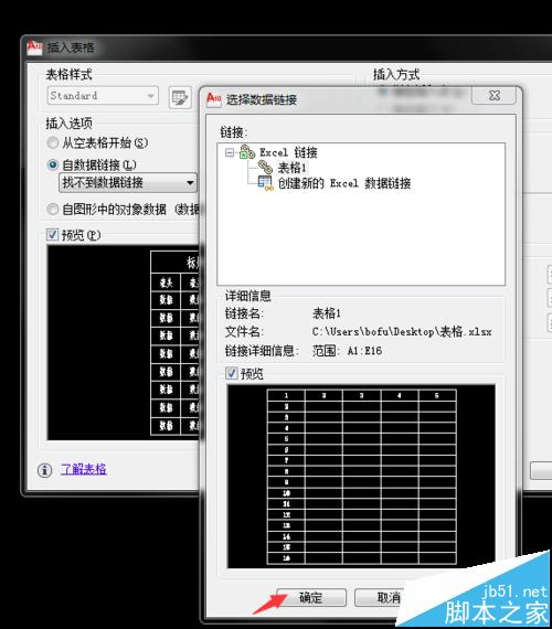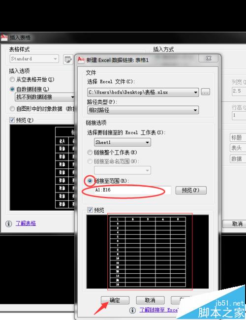 5、彈出【新建EXCEL數(shù)據(jù)鏈接;表格1】對(duì)話框,鉤選【鏈接至范圍】,填入你要鏈接的數(shù)據(jù)范圍,可預(yù)覽查看,最后【確定】