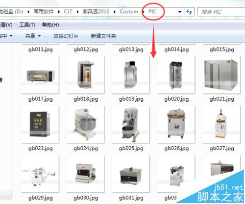 1、首先,將產品圖片按照規則命名【品牌拼音首字母+三位編碼.jpg】如:廚具通命名為cjt001.jog(命名不能同其他品牌重復),并存放在廚具通安裝路徑的“PIC”文件中