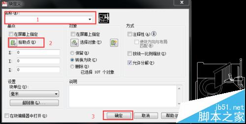 4、調整完畢后對圖塊進行分解(X)、再創建(B),在“塊定義”彈窗中,填寫名稱chujut_0000000..(編號不能有重復)、設置拾取點(產品背面左下角)。