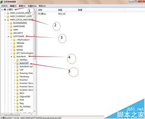 2、打開運行,輸入“regedit”確認運行,然后就打開我們電腦所有的注冊表信息了,先找到文件夾“HKEY_LOCAL_MACHINE”打開找到文件夾“SOFTWARE”再打開找到文件夾“Autodesk”再打開找到文件夾“AutoCAD”然后刪除這個文件夾。