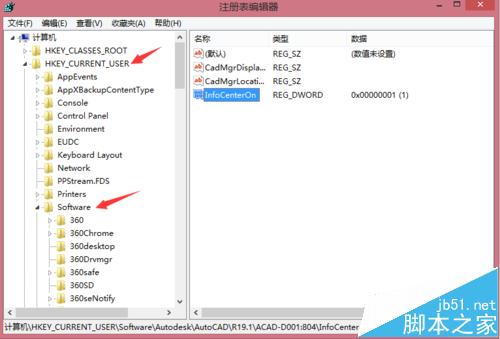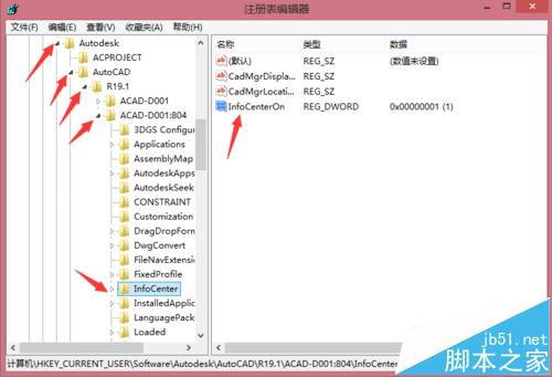 2、依次展開注冊表:HKEY_CURRENT_USER/Software/Autodesk/AutoCAD/R19.1/ACAD-A001:804/InfoCenter