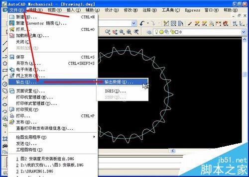 1)點(diǎn)擊AutoCAD主菜單的“文件(F)”菜單,選擇”輸出(E)…“,再選”輸出數(shù)據(jù)(E)…“。