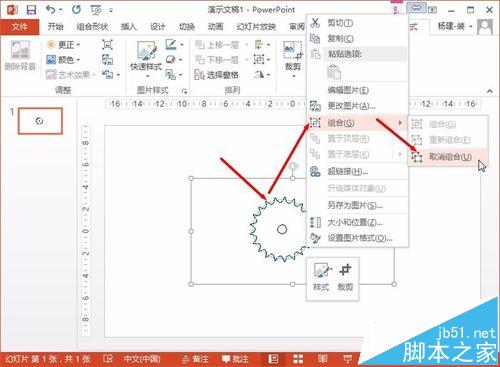2)點(diǎn)擊鼠標(biāo)右鍵,在彈出的快捷菜單中選擇“組合(G)”,再選擇“取消組合(U)”。