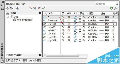 將復(fù)制到新文件的是個視圖按“長對正,寬相等,高平齊”的原則排列好,并在圖層特性管理框中,將西南軸測圖的圖層“ios-HID”的可見性關(guān)閉。