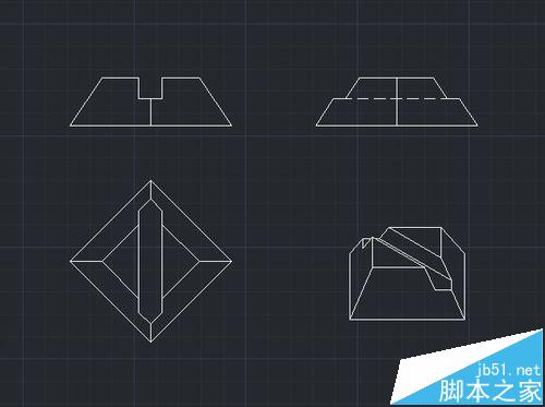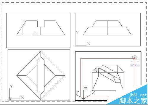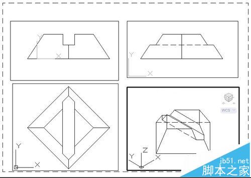 將生成的四個二維輪廓圖,復(fù)制到新的文件中,便于四個視圖的排列和修改。同時(shí)注意西南軸測圖的復(fù)制是應(yīng)當(dāng)注意,選取西南軸測圖時(shí)要用到“視圖”命令來選擇其他執(zhí)行正規(guī)復(fù)制粘貼即可。