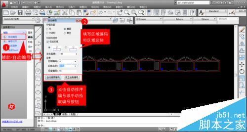 4、自動編號功能,首先點擊頁面左側的“輔助-自動編號”按鈕。然后在彈出的窗口內填寫區域編碼(如A/B/C)和區域名稱(如面點/粗加工)。第三,點擊自動排序編號(不按順序)或者是手動拾取編號(按照自選順序)。第四,選擇需要編號的設備,按回車即可自動編號。在彈出窗口可編輯編號的格式。